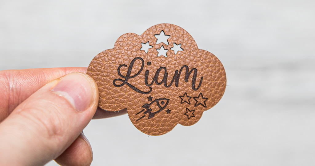 Etichetta in pelle vegetale incisa laser a forma di nuvola con razzo e stelle. Personalizza ora.